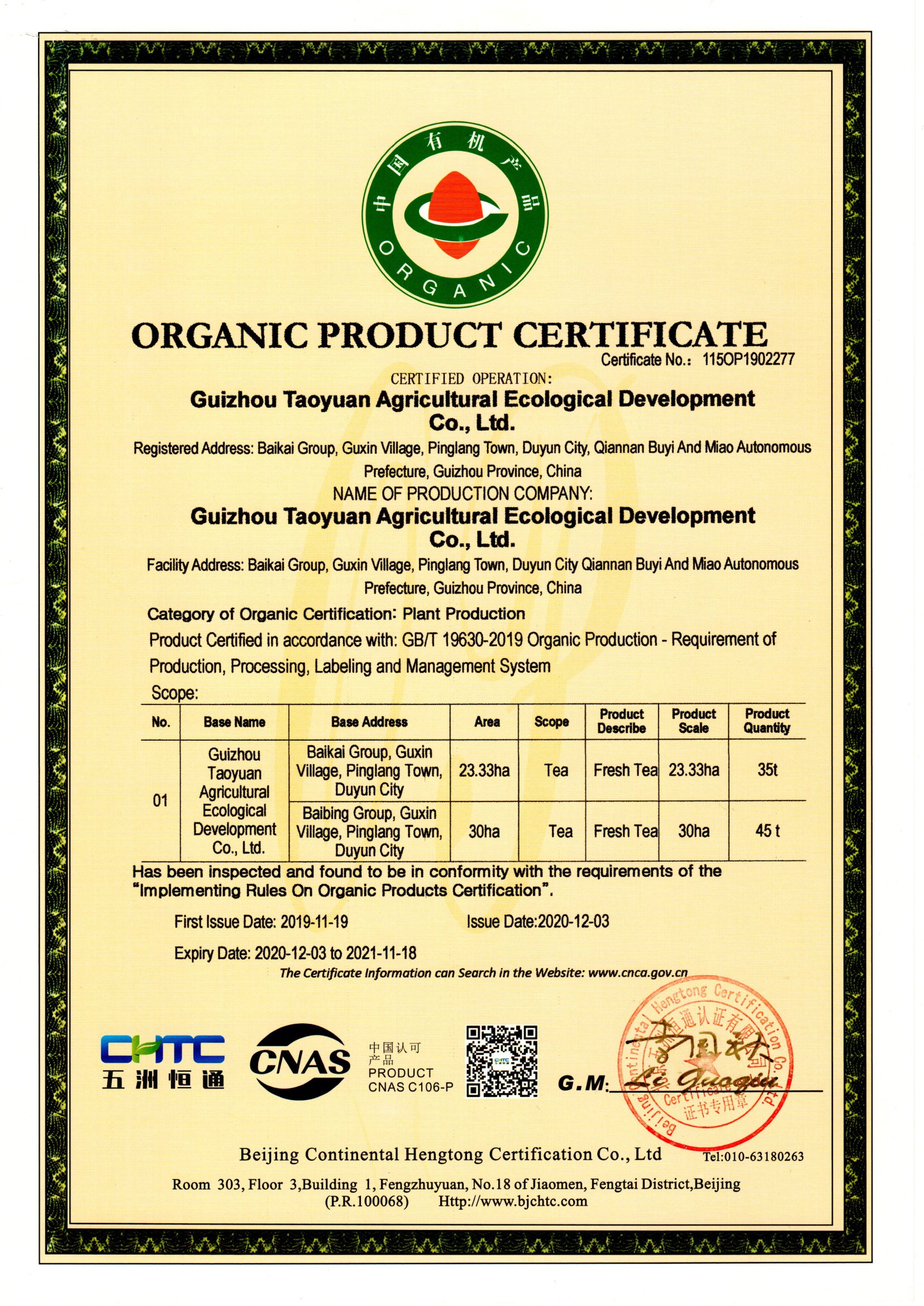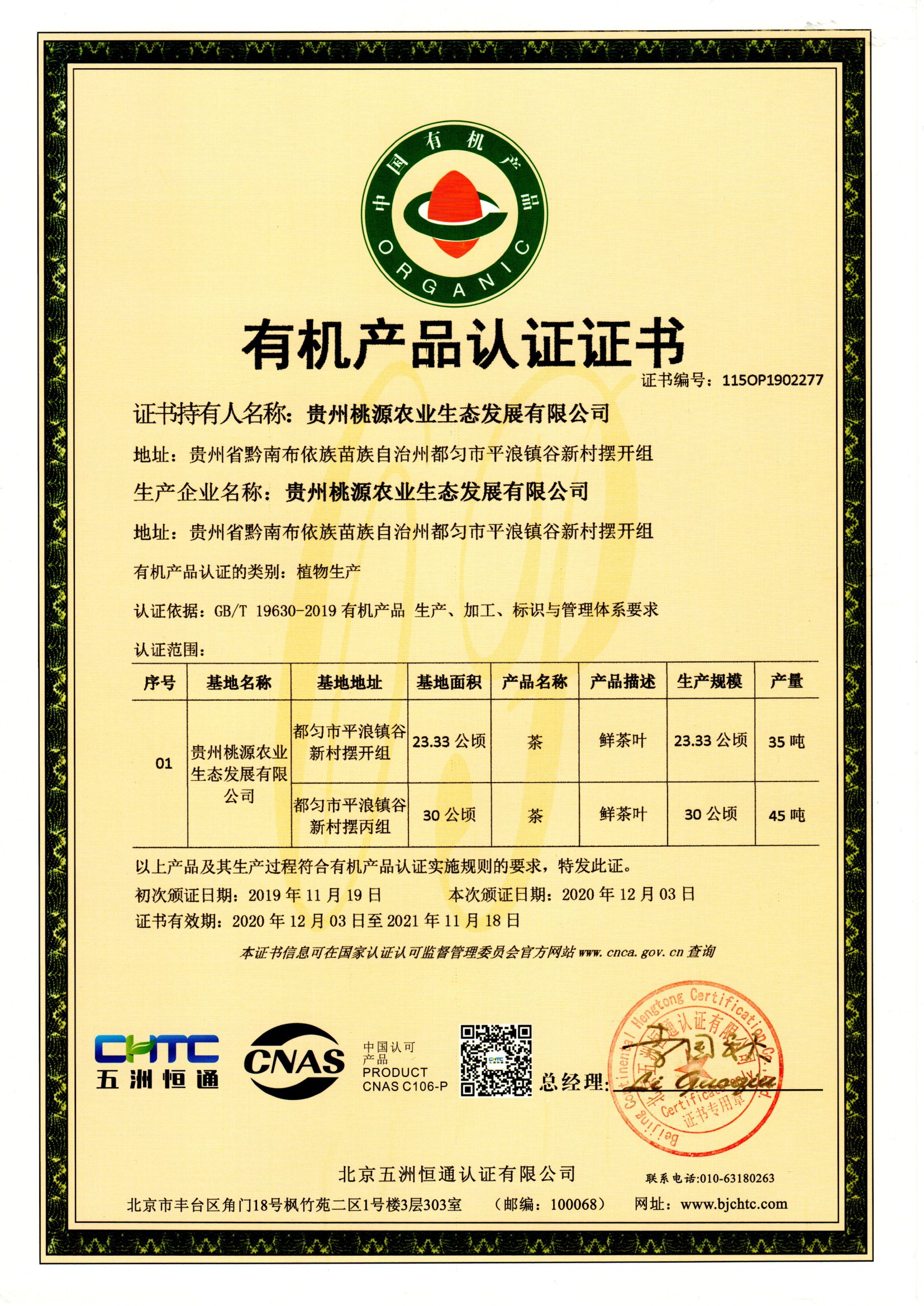 公司于2020年(nián)12月3日(rì)獲得(de)《有機(jī)産品認證證書(shū)》,公司勵志做好一杯幹淨茶;