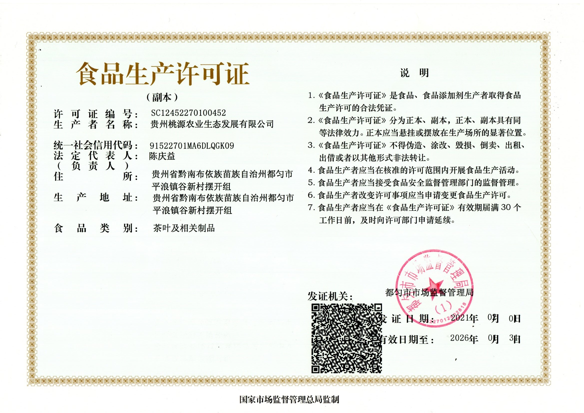 貴州林森現代農業發展有限公司獲得(de)《食品生(shēng)産許可(kě)證》